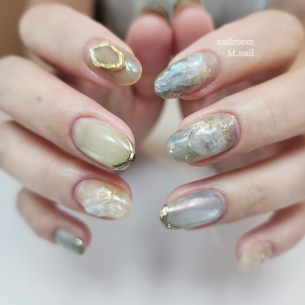 薬指のゴールドリーフアートとストーンが、さりげなく華やかさをプラス✨