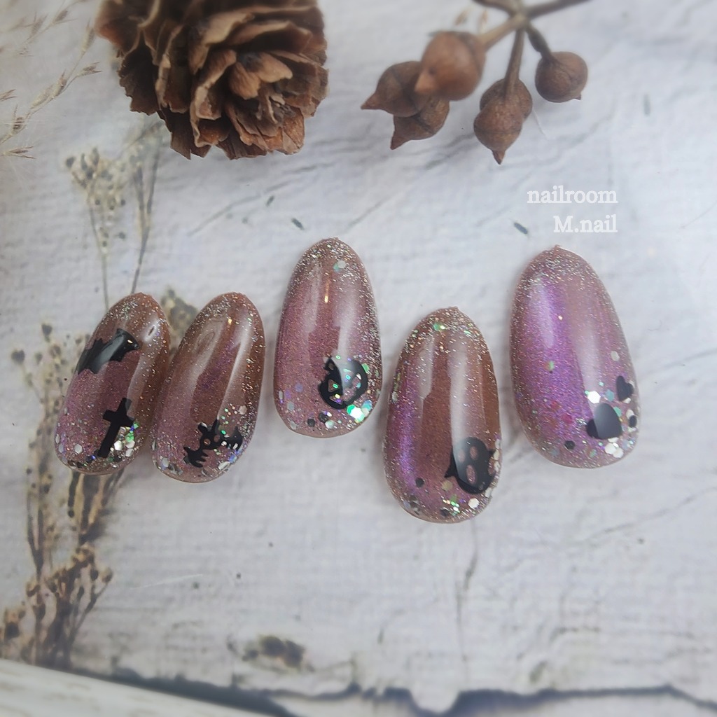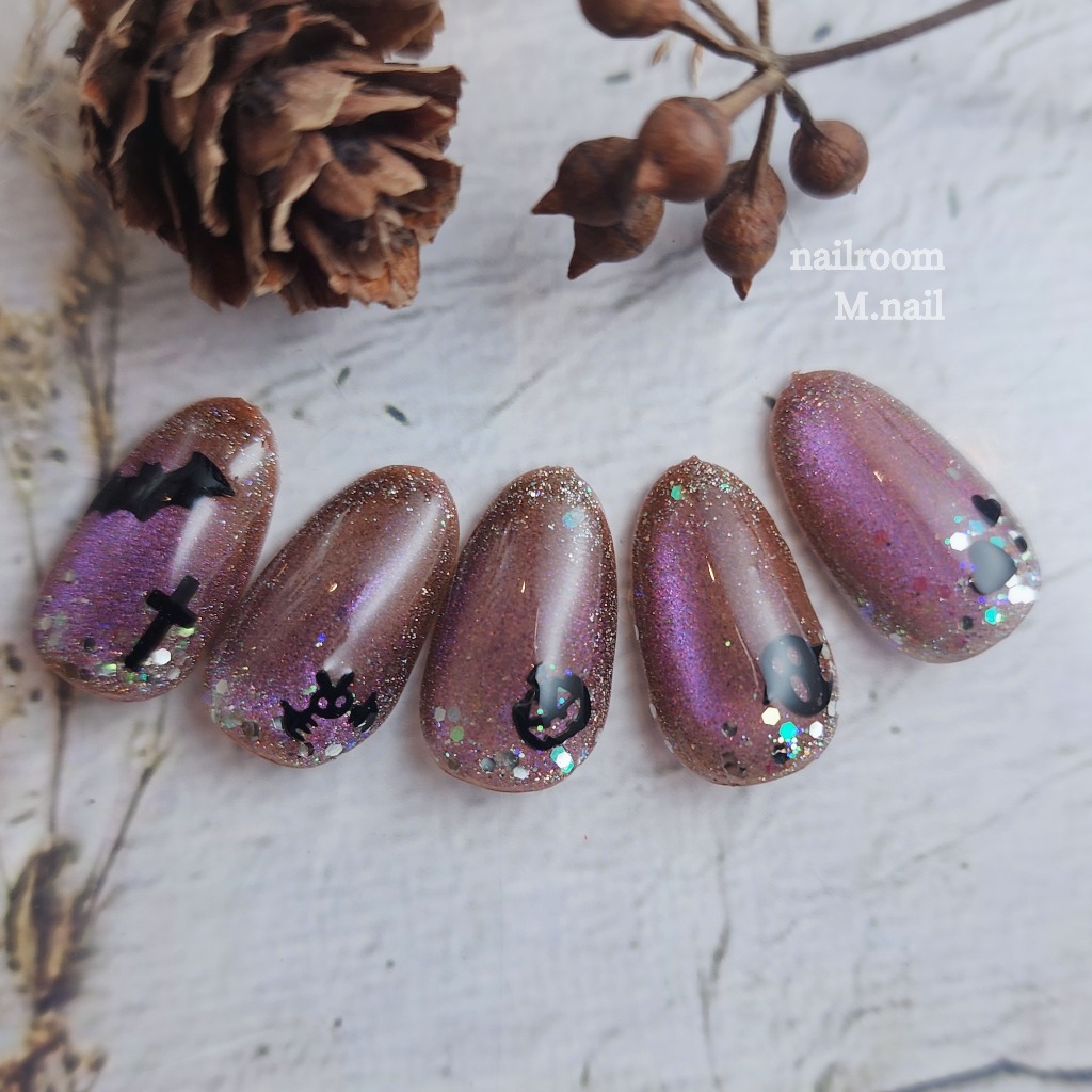 指先にはコウモリ、かぼちゃやおばけなどのハロウィンモチーフを散りばめ、季節感たっぷりに仕上げました😊
