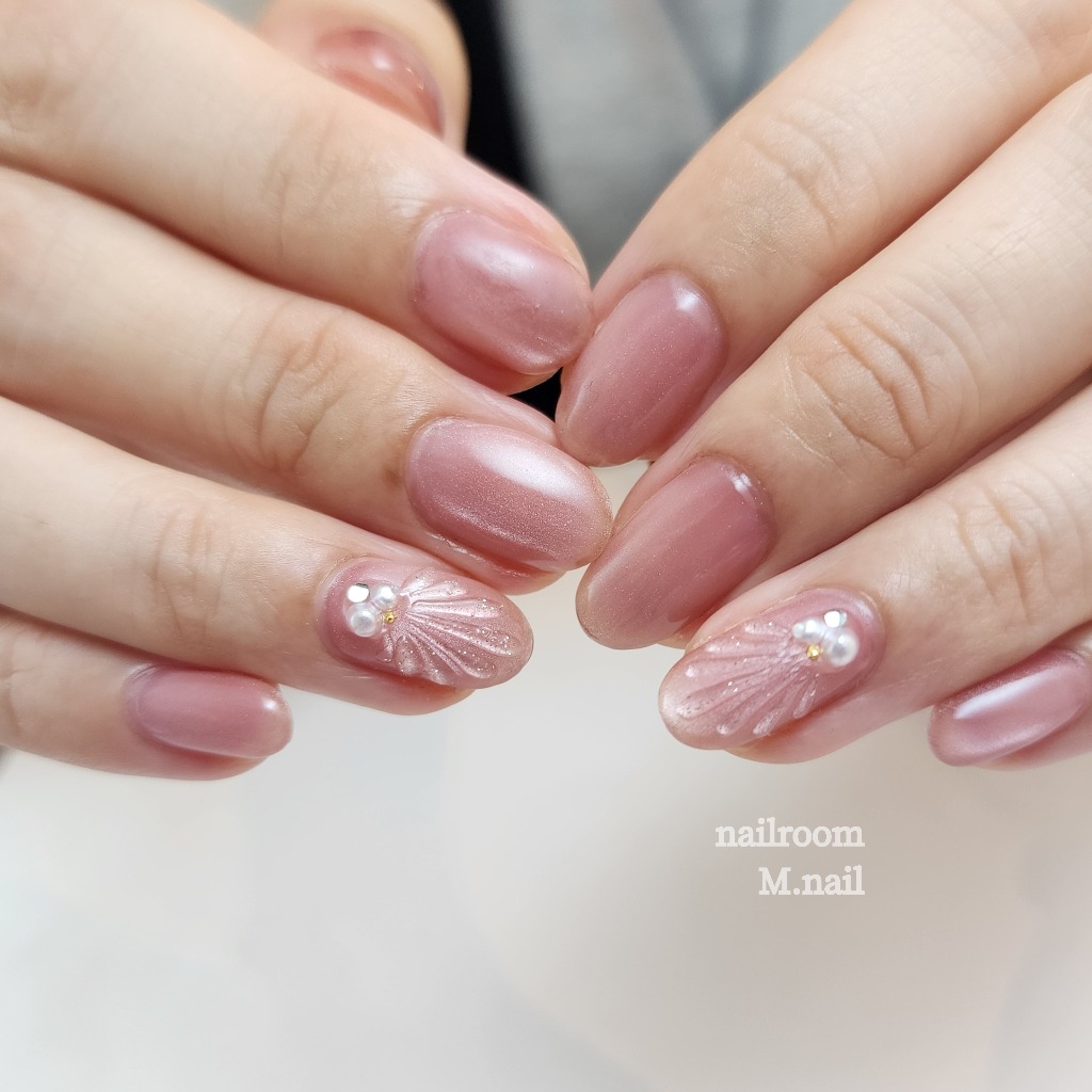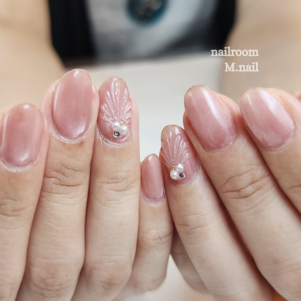 ピンクのマグネットに貝殻風のぷっくりマーメイドネイル✨