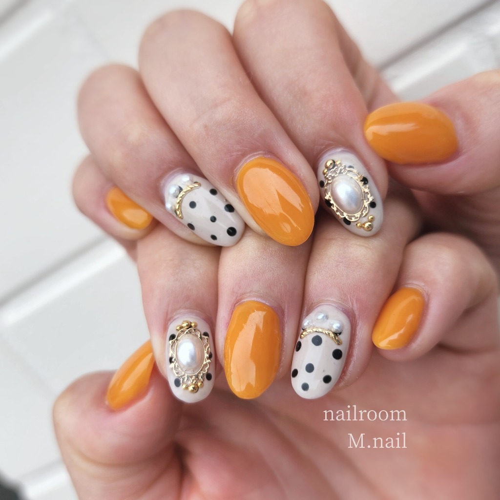 オレンジのカラーとホワイトベースのドットが可愛い❤️