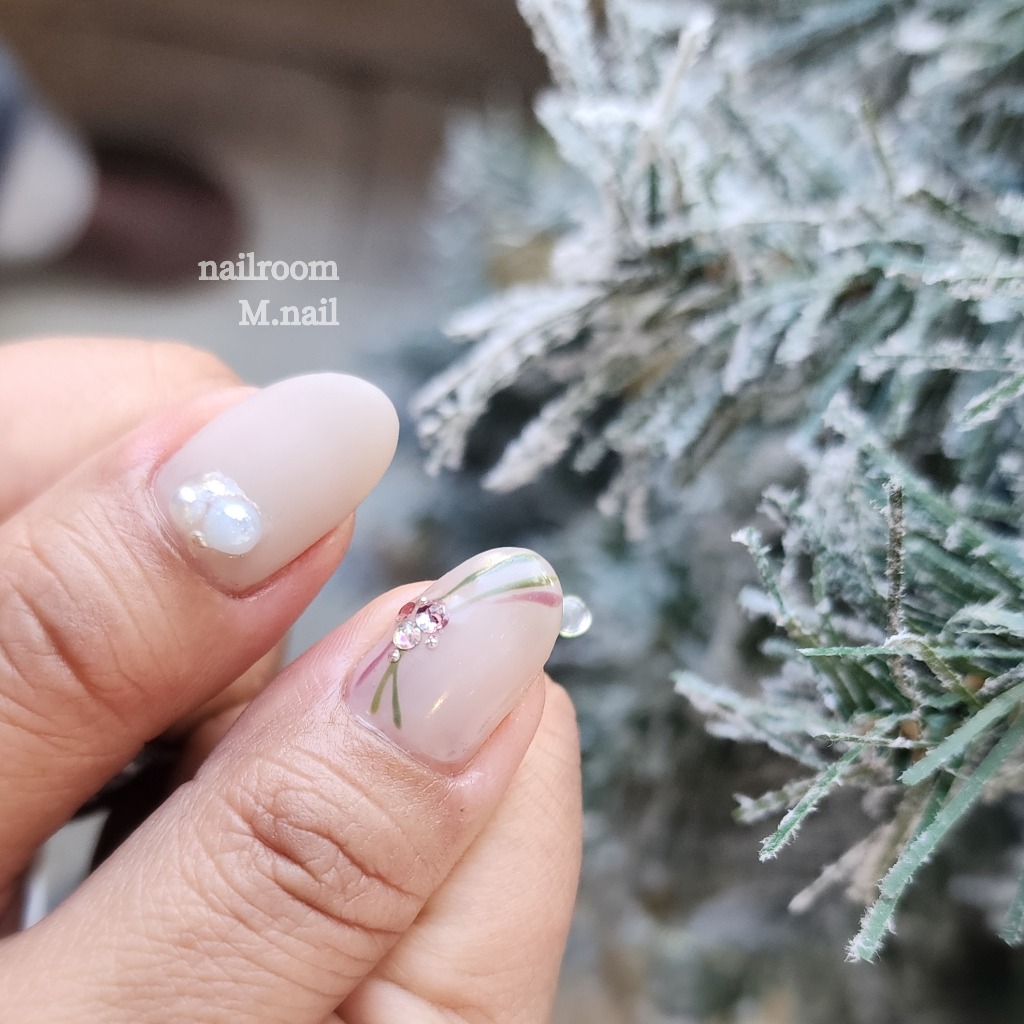 ほんのりピンクのチークにクリスマスリースとツリーをさりげなく入れてシンプルながらも大人可愛いクリスマスネイル✨